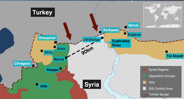 Forças militares turcas atravessaram a fronteira turco-síria em uma tentativa de anexar a cidade síria de Jarabulus. A operação inclui não apenas as forças militares turcas, mas também uma multidão de militantes apoiados pelo ocidente, os denominados “rebeldes moderados” do Exército Livre Sírio. A operação seria destinada, supostamente, a liberar a cidade do chamado Estado Islâmico, bem como freiar o avanço das forças curdas -apoiadas também pelos EUA- .