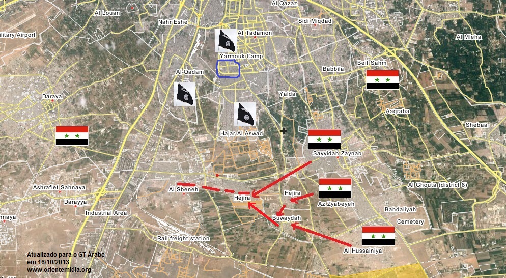 Em 7/11/2013, o Exército Sírio recuperou a região de Sbina (círculo maior em azul) fechando o cerco nesta região e consequentemente cortando o apoio aos grupos armados nos campos de Yarmouk e Palestina (círculo menor em azul). As setas em preto mostram as rotas de fuga dos combatentes em direção à região de Hajar Al Assouad.