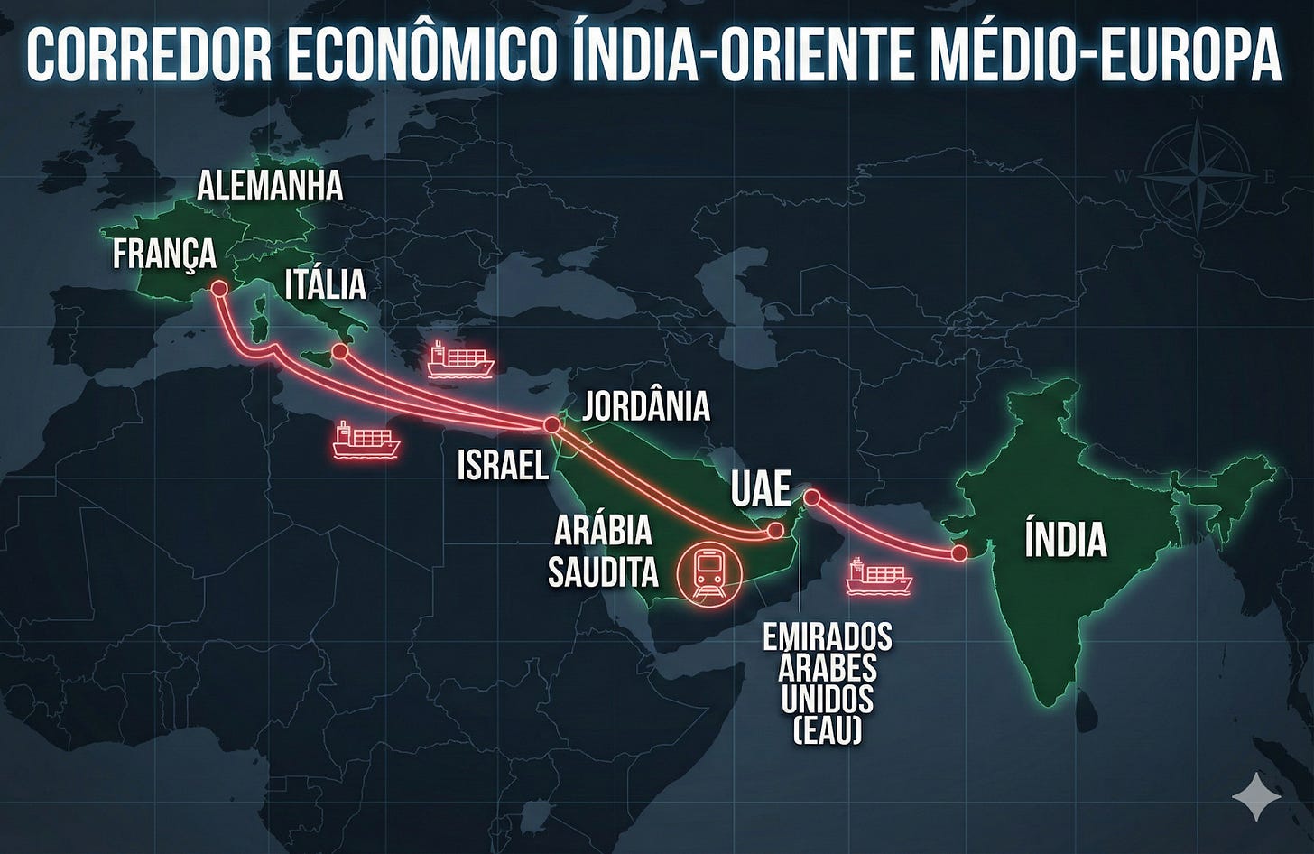A Índia, rival geográfico da China na Ásia, não tardou em desenvolver seu próprio projeto, o IMEC – o “Corredor Índia-Oriente-Médio-Europa”, rivalizando com a iniciativa “Cinturão e Rota” chinesa e deixando de lado tanto o Paquistão quanto o Irã, priorizando outros atores regionais, neste caso a Arábia Saudita, os EAU, a Jordânia e Israel [5].
