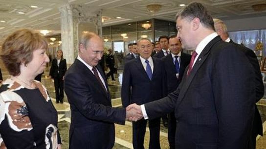Putin e Poroshenko cumprimentam-se ante alguns euroburocratas |
